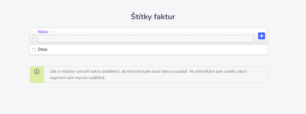 Štítky slouží pro lepší přehled ve fakturách, dají se zobrazit statistiky, podle jednotlivých štítků.